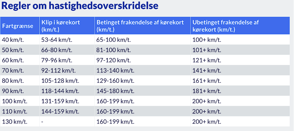 Betinget frakendelse: Fartoverskridelse over 60 procent eller fart på mindst 160 km/t. For personbil med anhænger med mere får du frakendt kørekortet betinget ved 40 procent overskridelse af hastighedsgrænsen.
